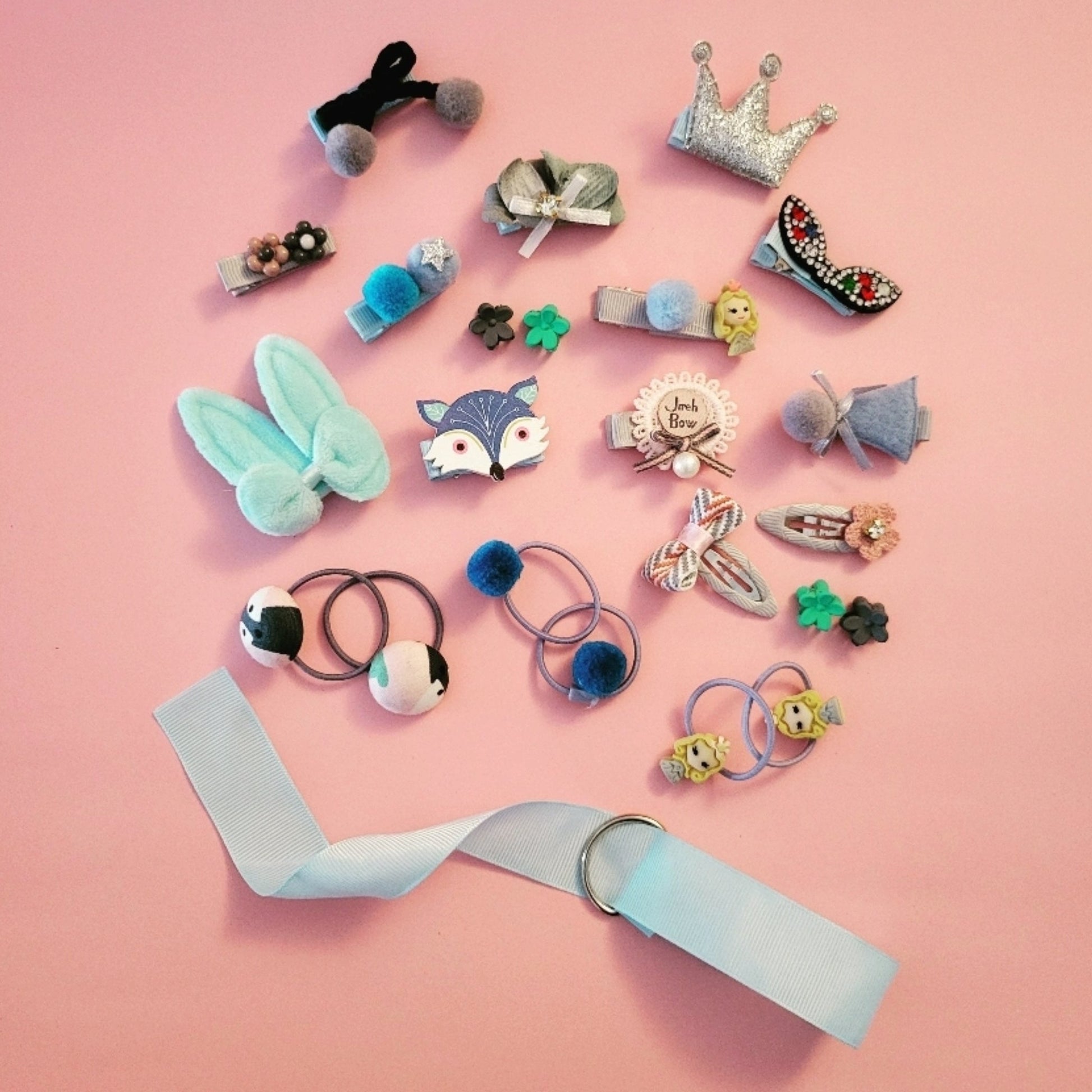 24 pieces of beautiful little girls hair accessories! comes in hair ties, snaps, clips, claw including a ribbon to hold your little pieces hanged on a ring.